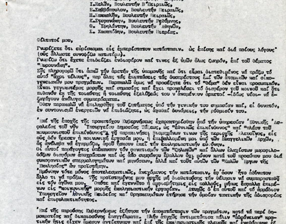 Πληροφορίες ΚατηγορίαΠοικίλα έγγραφαΌνομα φακέλου που ανήκει:1960-1969 ΔΙΑΦΟΡΑ 1965Α/Α εγγράφου:1Υπογράφειπ. Γεώργιος  ΠυρουνάκηςΠαραλήπτης:Πρόεδρος Κυβερνήσεως Γ....