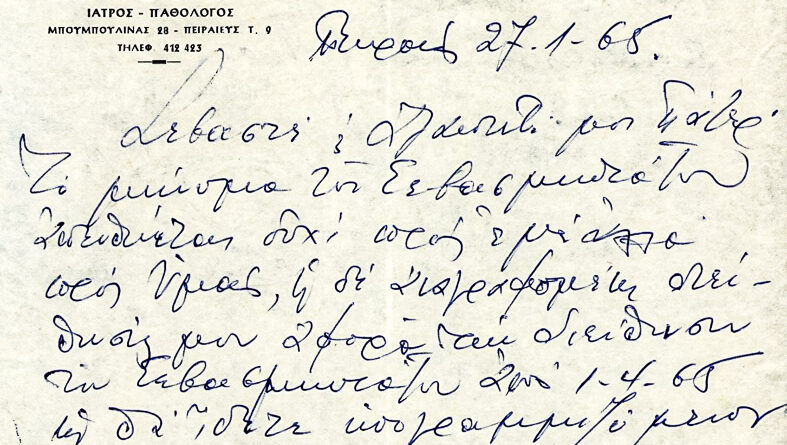 Πληροφορίες ΚατηγορίαΠοικίλα έγγραφαΌνομα φακέλου που ανήκει:1960-1969 ΔΙΑΦΟΡΑ 1965Α/Α εγγράφου:1Υπογράφειπ. Γεώργιος  ΠυρουνάκηςΠαραλήπτης:Ελπίδιος ΣτεφάνουΗμερομηνία:18/10/65Θέμα -...
