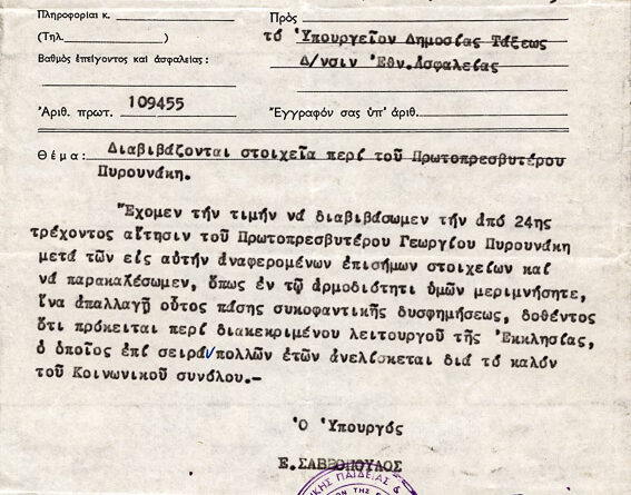 Πληροφορίες ΚατηγορίαΠοικίλα έγγραφαΌνομα φακέλου που ανήκει:1960-1969 ΔΙΑΦΟΡΑ 1965Α/Α εγγράφου:1Υπογράφειπ. Γεώργιος  ΠυρουνάκηςΠαραλήπτης:Πρόεδρος Κυβερνήσεως Γ....