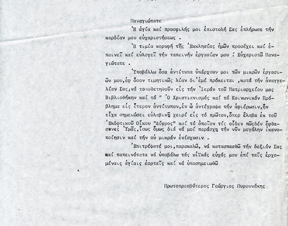 Πληροφορίες ΚατηγορίαΠοικίλα έγγραφαΌνομα φακέλου που ανήκει:1960-1969 ΔΙΑΦΟΡΑ 1965Α/Α εγγράφου:1Υπογράφειπ. Γεώργιος  ΠυρουνάκηςΠαραλήπτης:Πρόεδρος Κυβερνήσεως Γ....
