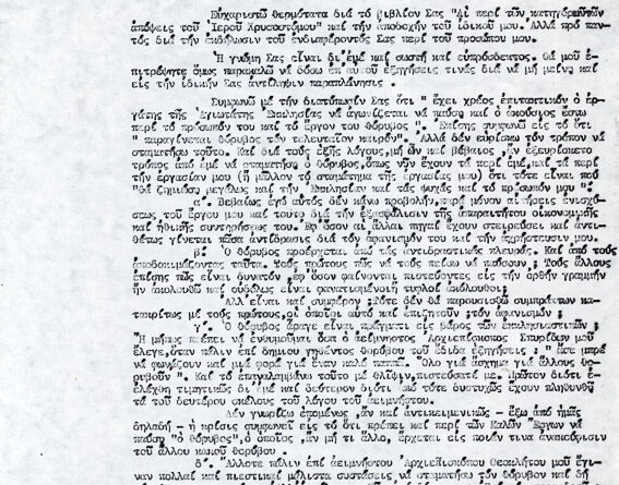 Πληροφορίες ΚατηγορίαΠοικίλα έγγραφαΌνομα φακέλου που ανήκει:1960-1969 ΔΙΑΦΟΡΑ 1965Α/Α εγγράφου:1Υπογράφειπ. Γεώργιος  ΠυρουνάκηςΠαραλήπτης:Ελπίδιος ΣτεφάνουΗμερομηνία:18/10/65Θέμα -...