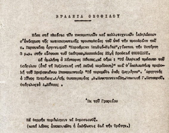 Πρόσκλησις σε βραδυά Θεόφιλου. Ομιλητής Ν. Μάτσας