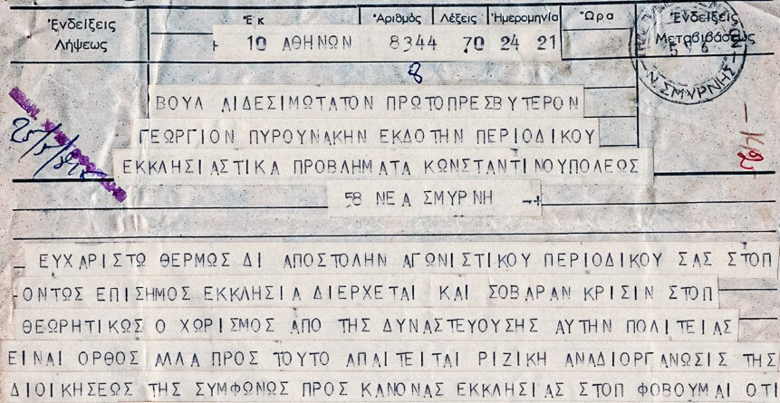 Τηλεγράφημα ευχαριστιών και συγχαρητηρίων για περιοδικό