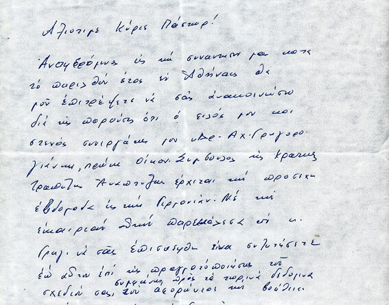 Επιστολή με θέμα την επίσκεψιν του Αχ. Γρηγορογιάννη εις Γερμανίαν και ανταλλαγή απόψεων
