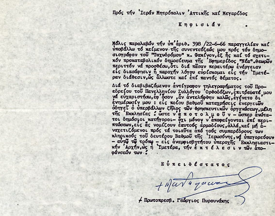 Επιστολή με συνημμένο το κείμενο συνεντεύξεως του εις “Ταχυδρόμον” κ. Φακίνον