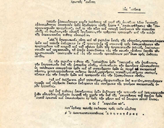 Επιστολή για εργασίαν του “Αναδιοργάνωσις των Εκκλησιαστικών πραγμάτων”