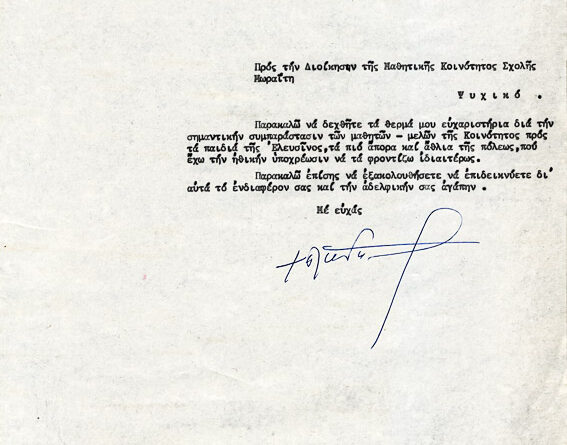 Επιστολή με ευχαριστίες για συμπαράσταση τους σε παιδιά Ελευσίνος. Συνημ. Ανακοίνωση για τα εγκαίνια της Φιλικής Φωλιάς