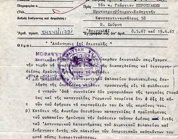 Πληροφορίες ΚατηγορίαΠοικίλα έγγραφαΌνομα φακέλου που ανήκει:1960-1969 ΠΟΙΚΙΛΑ ΕΓΓΡΑΦΑ 1967Α/Α εγγράφου:2Υπογράφειπ. Γεώργιος  ΠυρουνάκηςΠαραλήπτης:Πατριάρχης ΑθηναγόραςΗμερομηνία:17/4/67Θέμα...