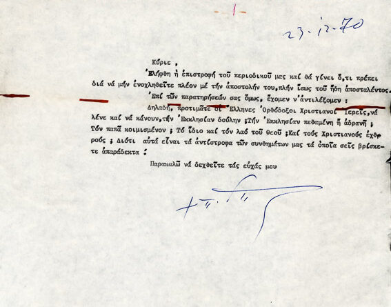 Πληροφορίες ΚατηγορίαΠοικίλα έγγραφαΌνομα φακέλου που ανήκει:1970-1979 ΠΟΙΚΙΛΑ ΕΓΓΡΑΦΑ 1970Α/Α εγγράφου:2ΥπογράφειΚοραλία ΘεοτοκάΠαραλήπτης:π. Γεώργιος  ΠυρουνάκηςΗμερομηνία:12ος...