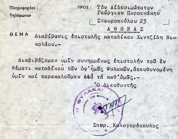 Διαβιβάζει επιστολή κρατουμένου