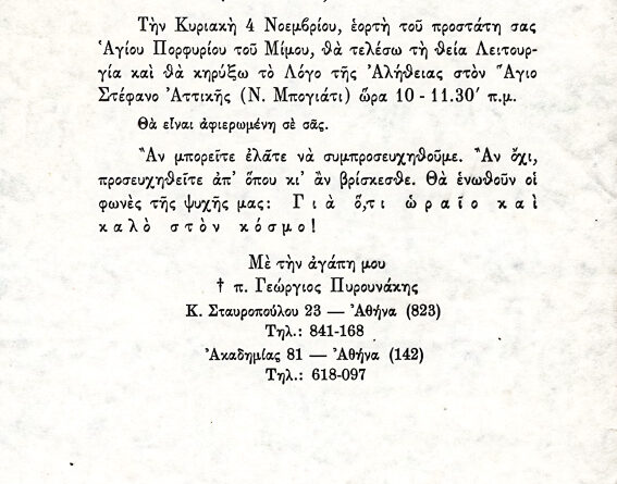 Ανακοίνωση για λειτουργία Αγ. Πορφυρίου