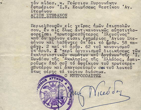 Επιστολή με θέμα αφαίρεση οφφικίου πρωτοπρεσβύτερου