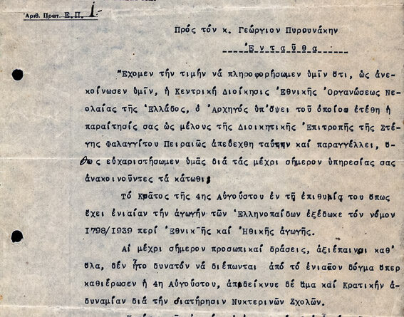 Πληροφορίες ΚατηγορίαΔιάφορα ΈγγραφαΌνομα φακέλου που ανήκει:1932-1960 ΔΙΑΦΟΡΑ ΕΓΓΡΑΦΑΑ/Α εγγράφου:2ΥπογράφειΓεώργιος ΠυρουνάκηςΠαραλήπτης:Κυβερνητικός εκπρόσωπος Οργανώσεως ΝεολαίαςΗμερομηνία:193;Θέμα...