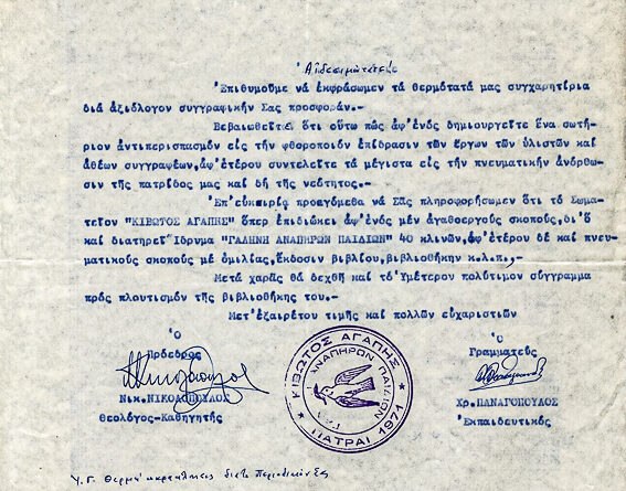 Αποστολή βιβλίου του για τη βιβλιοθήκη τους