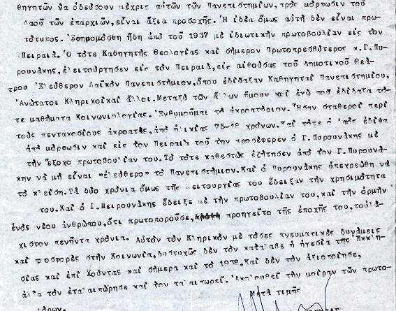 Εξαίρει την πρωτοπορία του π. Γ. Π. να ιδρύσει Λαϊκό Πανεπιστήμιο στον Πειραιά από το 1937