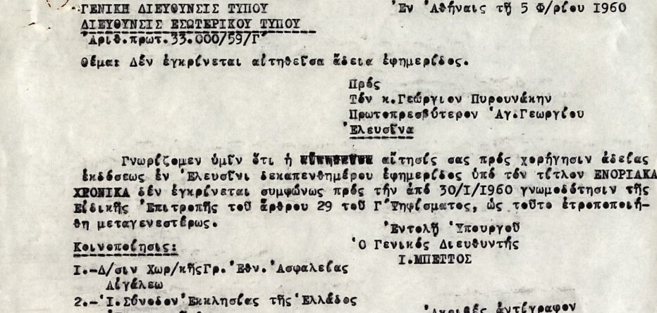Ανακοίνωση ότι δεν εγκρίνεται η αίτηση εκδόσεως 15μέρου περιοδικού