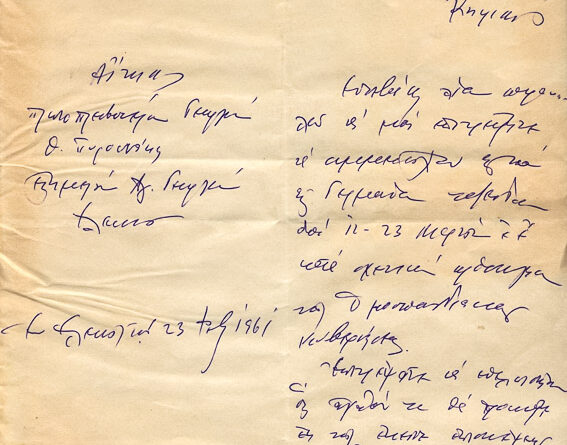 Πληροφορίες ΚατηγορίαΠοικίλα έγγραφαΌνομα φακέλου που ανήκει:1960-1969 ΔΙΑΦΟΡΑ 1961Α/Α εγγράφου:2ΥπογράφειΓιώργης από ΒόννηΠαραλήπτης:π. ΠυρουνάκηςΗμερομηνία:4/1/61Θέμα -...