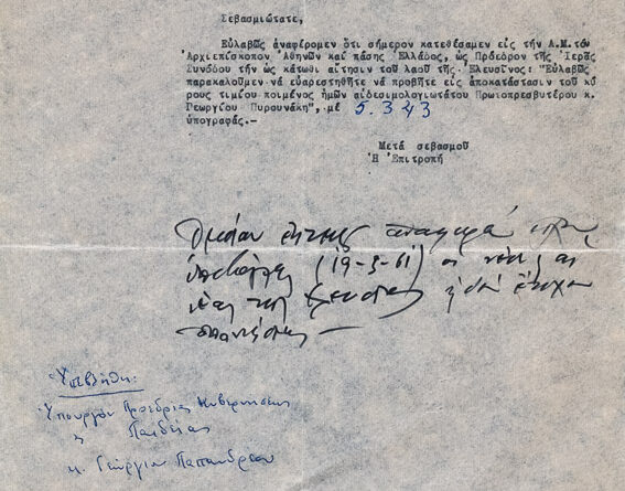 Επιστολή με θέμα καταθέσεως αιτήσεως του λαού της Ελευσίνος στον Αρχιεπίσκοπο & στον Υπουργό Προεδρίας της Κυβερνήσεως & Παιδείας & κ. Γ. Παπανδρέου