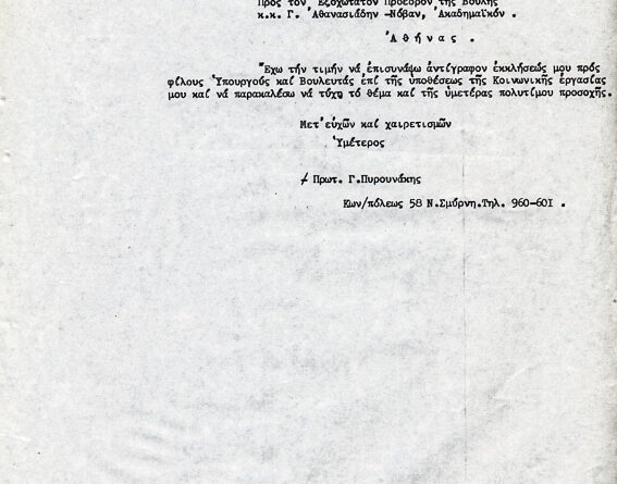 Αντίγραφον εκκλήσεως π. Πυρουνάκη προς υπουργούς & βουλευτάς δια την κοινωνικήν εργασίαν του και έγγραφα Βουλής και Υπουργού Δημοσίας Τάξεως ότι δεν εχαρακτηρίσθη ο π. Πυρουνάκης ως “αντεθνικώς δρών”